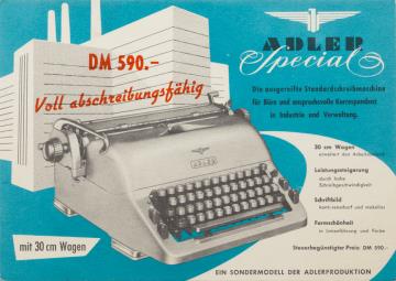 Werbepostkarte; Grafik, polychrom; Rückseite: Schreibmaschine Adler Special und Werbetext; Vorderseite mit Werbespruch "Wer Adler schreibt. Bei Adler bleibt"; nicht beschrieben