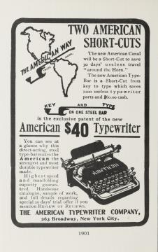 Werbepostkarte, Nachdruck; Grafik, monochrom Rückseite: Schreibmaschine American, Werbetext, unterhalb der Umrahmung die Jahreszahl 1901; Vorderseite nicht beschrieben
