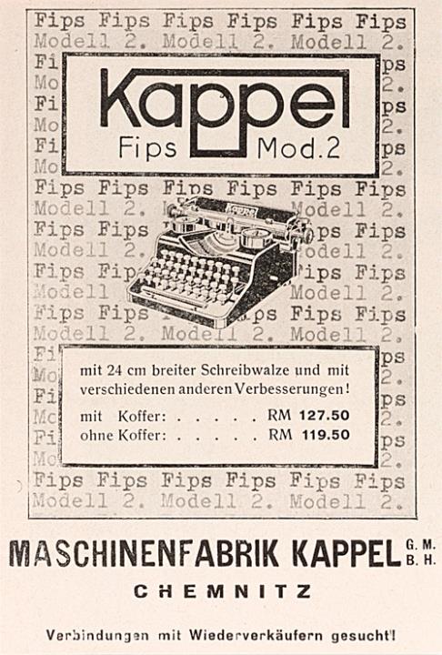 Werbeanzeige für Schreibmaschine Kappel Fips monochrom