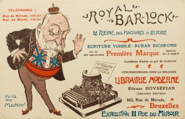 Werbepostkarte; Grafik, polychrom Vorderseite: Karikaturzeichnung König Edwards VII mit Schreibmaschine Bar Lock Royal, Werbetext; Rückseite nicht beschrieben