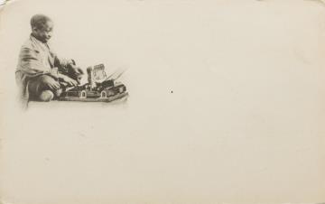Illustrierte Postkarte; Fotografie, monochrom Rückseite: Junge im Schneidersitz mit Schreibmaschine Bar-Lock, Leerraum zur Beschriftung Vorderseite nicht beschrieben