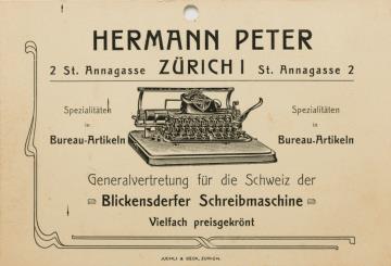 Werbepostkarte; Grafik, monochrom Rückseite: Schreibmaschine Blickensderfer, Werbetext Vorderseite nicht beschrieben