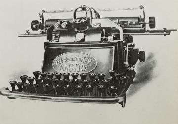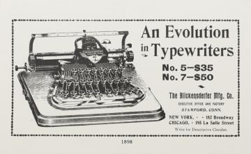 Werbepostkarte, Nachdruck; Grafik, monochrom Rückseite: Schreibmaschine Blickensderfer, Werbetext, unterhalb der Umrahmung die Jahreszahl 1898; Vorderseite nicht beschrieben
