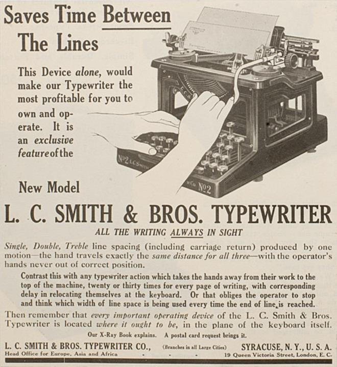 Saves Time Between The Lines. New Model L. C. Smith & Bros. Typewriter