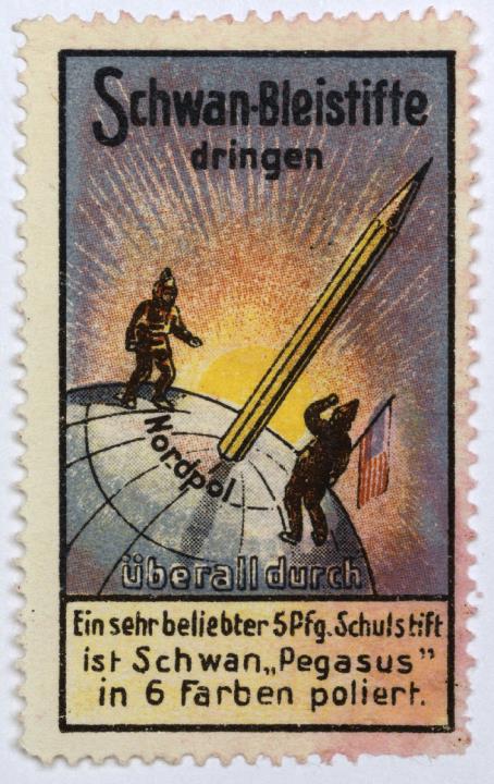 Reklamemarke/Werbemarke für Schreibstifte Schwan; rechteckig, polychrom weiterer Text: Ein sehr beliebter 5Pfg. Schulstift ist Schwan "Pegasus" in 6 Farben poliert