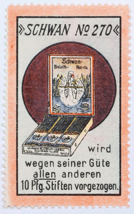 Reklamemarke/Werbemarke für Schreibstifte Schwan; rechteckig, polychrom weiterer Text: ...wird wegen seiner Güte allen anderen 10 Pfg. Stiften vorgezogen