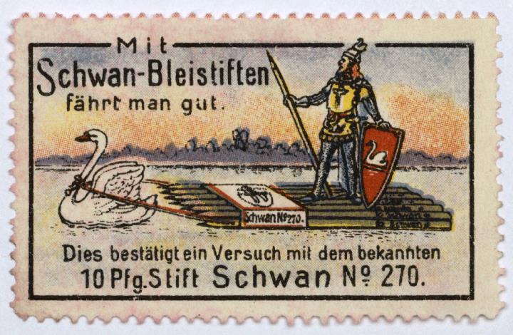 Reklamemarke/Werbemarke für Schreibstifte Schwan; rechteckig, polychrom weiterer Text: Dies bestätigt ein Versuch mit dem 10 Pfg.Stift Schwan No. 270