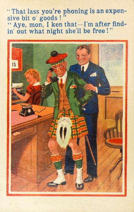 Illustrierte Postkarte; Grafik, polychrom; XL Series Nr. V 4018 Rückseite: Büroszene; Mann in schottischer Tracht beim Telefonieren, dahinter Mitarbeiter und Sekretärin mit Schreibmaschine Vorderseite nicht beschrieben
