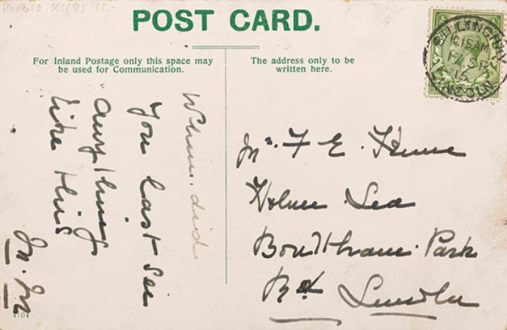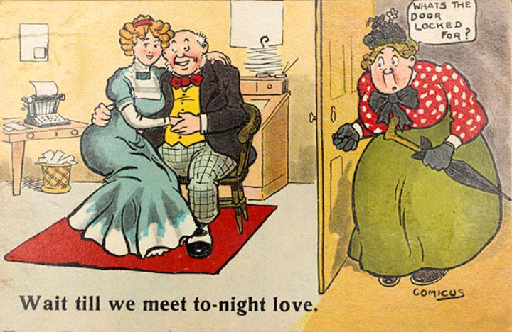 Illustrierte Postkarte; Grafik, polychrom; Nr. 4104 Rückseite: Büroszene; Vorgesetzter und Sekretärin als Paar, Ehefrau steht vor der Tür Vorderseite: beschrieben und adressiert; Briefmarke Postage Revenue (U.K.) Half Penny; Poststempel Billinghay/17 Sp 1915