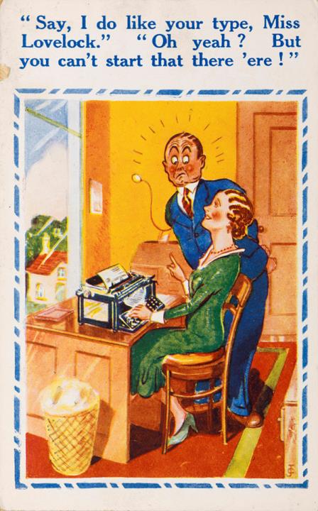 Illustrierte Postkarte; Grafik, polychrom; Nr. 4662 Rückseite: Büroszene; Vorgesetzter und Sekretärin mit Schreibmaschine Vorderseite nicht beschrieben