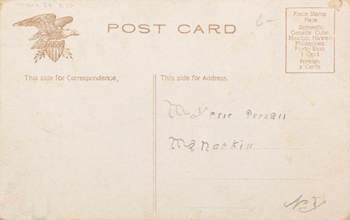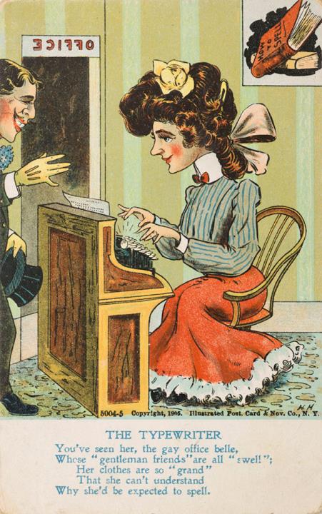 Illustrierte Postkarte; Grafik, polychrom; Nr. 5004-5 copyright 1905 Illustrated Post Card, NY Rückseite: Büroszene; Mann und Sekretärin mit Schreibmaschine, darunter Text in Versform Vorderseite beschrieben