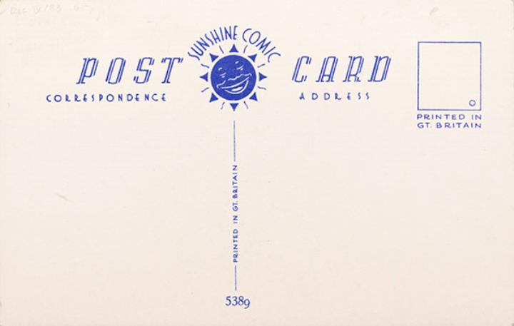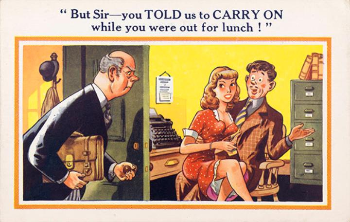Illustrierte Postkarte; Grafik, polychrom; Nr. 5389 Rückseite: Büroszene; Mitarbeiter und Sekretärin mit Schreibmaschine als Paar, Vorgesetzter betritt das Büro Vorderseite nicht beschrieben
