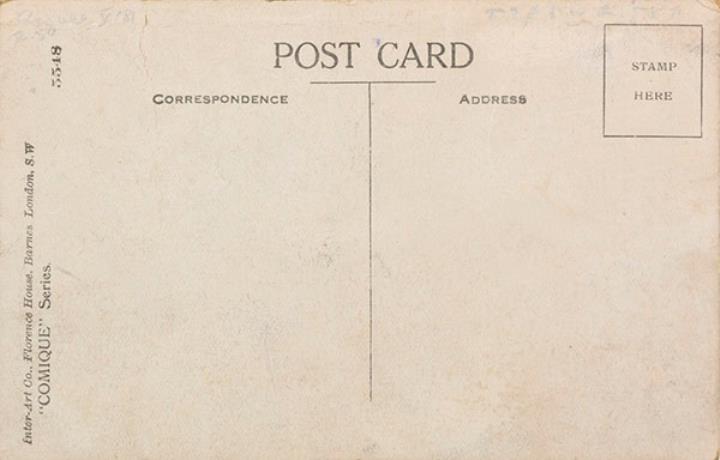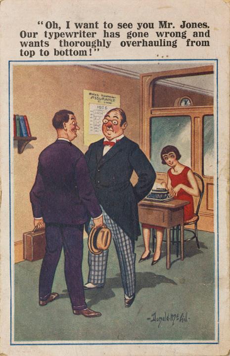 Illustrierte Postkarte; Grafik, polychrom; Comique Series Nr. 5518 Rückseite: Büroszene; Vorgesetzter und Kunde im Gespräch, Sekretärin mit Schreibmaschine Vorderseite nicht beschrieben