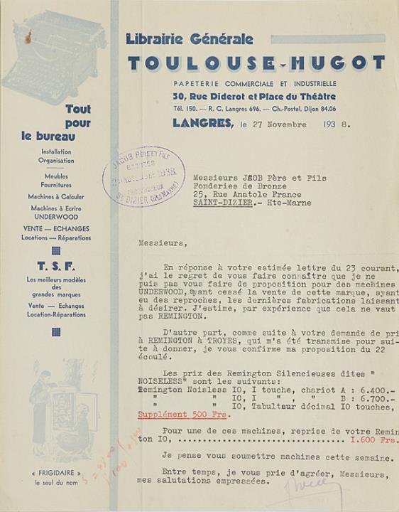 Brief der Bürowarenhandlung Toulouse-Hugot, Langres adressiert an Messieurs Jacob Pére et Fils, Saint-Dizier; datiert 27.11.1938 Maschinenschrift, unterschrieben
