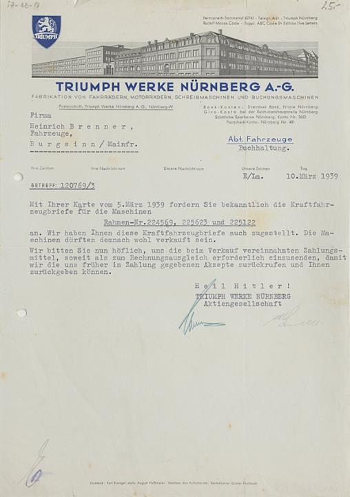 Brief der Triumph Werke A.G./Abt. Fahrzeuge, Nürnberg adressiert an Firma Brenner, Burgsinn; datiert 10.03.1939 Maschinenschrift, unterschrieben