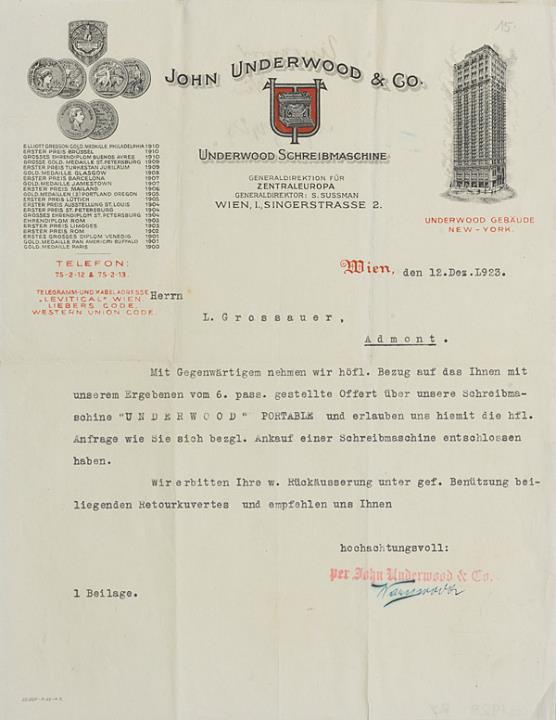Brief der John Underwood & Co., Wien adressiert an Herrn Grossauer, Admont; datiert 12.12.1923 Maschinenschrift, unterschrieben