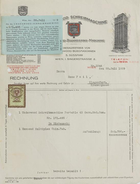 Rechnung der Firma John Underwood & Co., Wien adressiert an Herrn Feil, Klagenfurt; datiert 29.07.1929 Maschinenschrift; mit Gebührenmarke