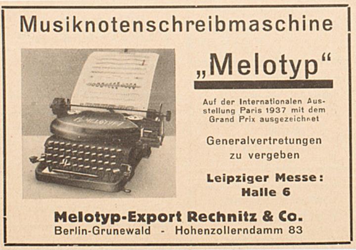 Werbeanzeige für Musiknoten-Schreibmaschine Melotyp monochrom