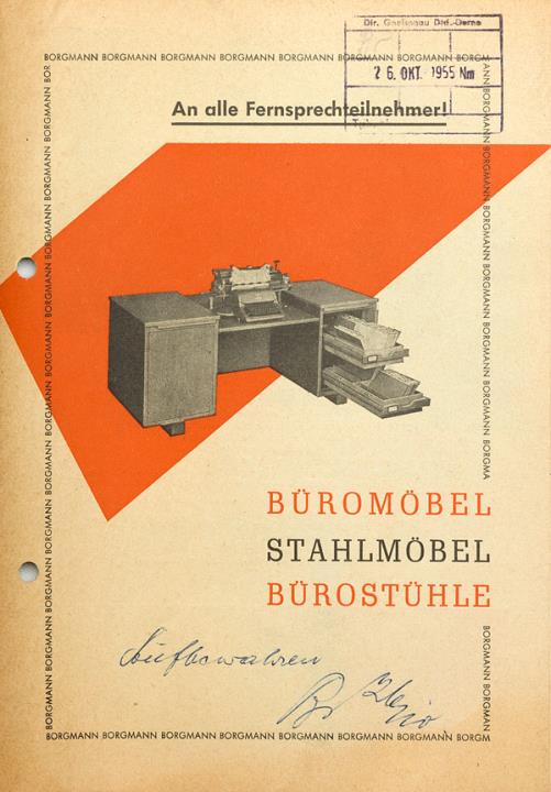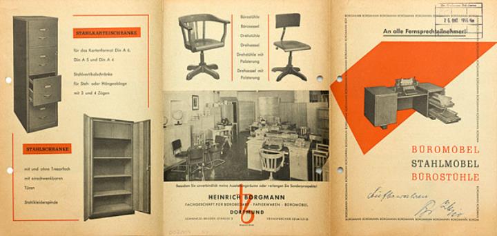 Faltprospekt der Bürowarenhandlung Heinrich Borgmann, Dortmund mit Datumstempel versehen