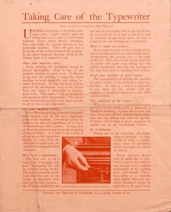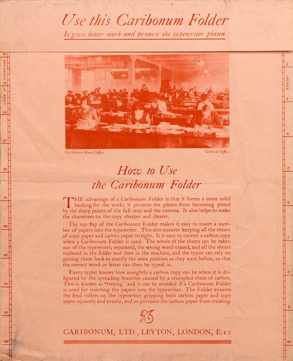 Beilage einer Packung Kohlepapier der Caribonum Ltd./London, welche als Unterblatt bei Durchschriften mit der Schreibmaschine benutzt wurde