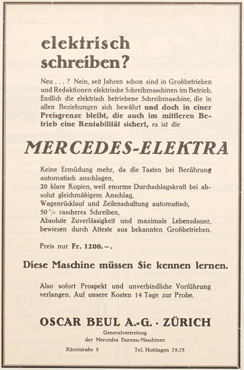 Werbeanzeige für Schreibmaschine Mercedes Elektra monochrom