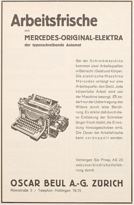 Werbeanzeige für Schreibmaschine Mercedes Elektra monochrom