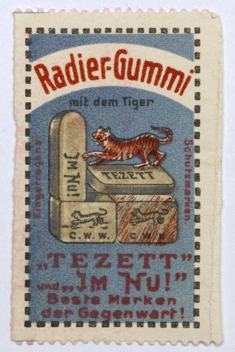 Reklamemarke/Werbemarke für Schreibzubehör C.W.W., C.W.N.; rechteckig, polychrom weiterer Text: "Tezett" und "Im Nu!" Beste Marken der Gegenwart!