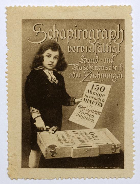 Reklamemarke/Werbemarke für Vervielfältigungsapparat Schapirograph; rechteckig, monochrom weiterer Text: [...] Hand- und Maschinenschrift oder Zeichnungen. 150 Abzüge in wenigen Minuten in einer oder vielen Farben zugleich