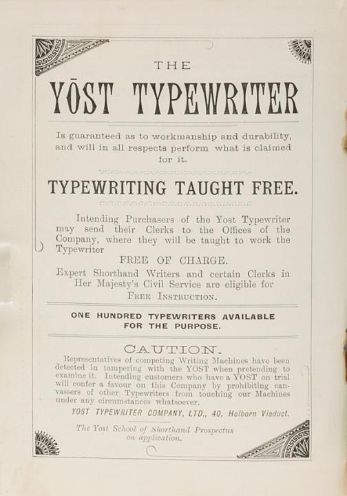 Next to literature on the history of technology, of the typewriter and the office, the Archive holds patent letters, textbooks and instruction manuals as well as historical postcards, letters, photographs and various kinds of advertising (leaflets and brochures, advertising stamps, newspaper ads, posters and signs, promotional gifts).