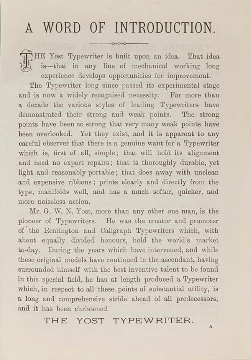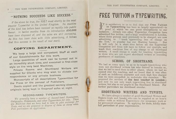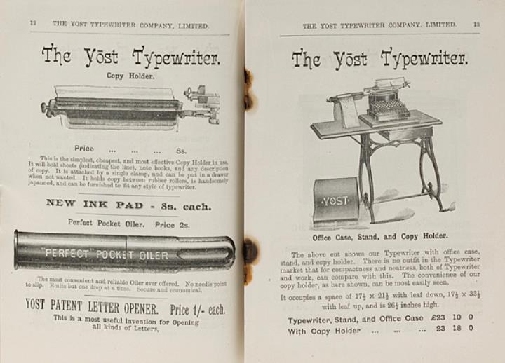 Prospekt für Schreibmaschine und Büromöbel Yost, zwei Exemplare (eines fotokopiert/gebunden)