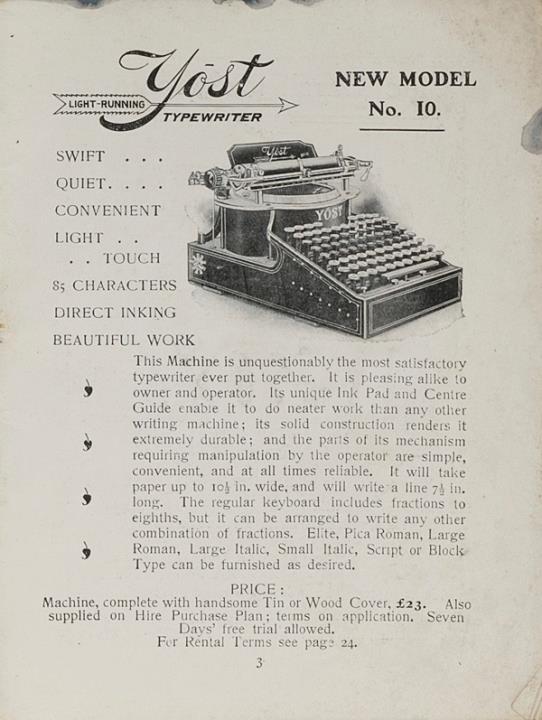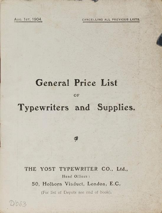 Prospekt mit Preisliste für Schreibmaschine und Bürobedarf Yost Stand 01.08.1904