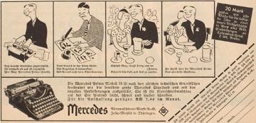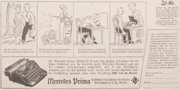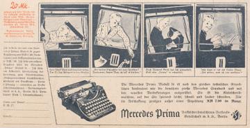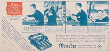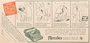 Werbeanzeige für Schreibmaschine Mercedes Prima 34 monochrom; auf Papier geklebt