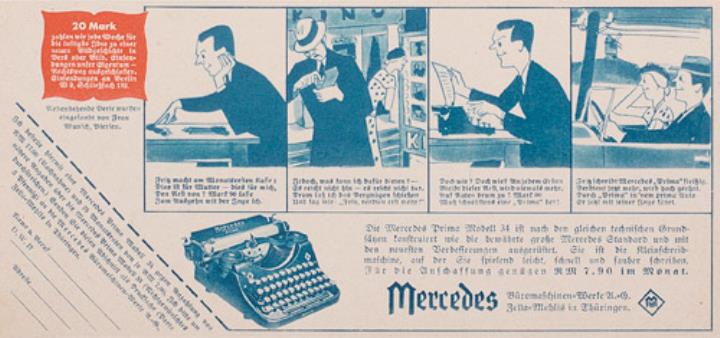Werbeanzeige für Schreibmaschine Mercedes Prima 34 polychrom
