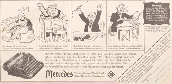 Werbeanzeige für Schreibmaschine Mercedes Prima 34 monochrom; auf Papier geklebt