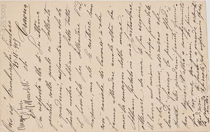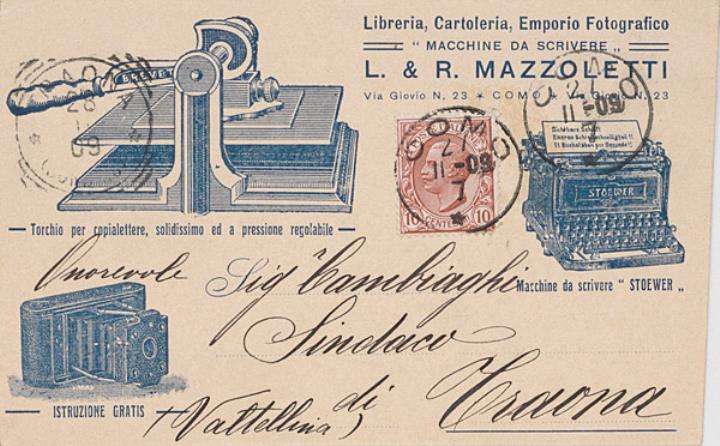 Postkarte mit Werbebild; Grafik, monochrom Vorderseite: Kopierpresse, Fotoapparat Kodak und Schreibmaschine Stoewer; adressiert an Sig. Sindaco di Craona; Briefmarke Poste Italiane 10 centesimi; Poststempel Como/27.11.1909 Rückseite beschrieben