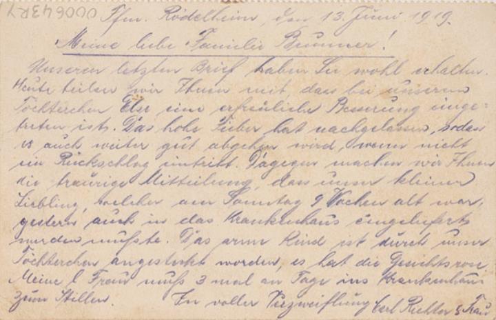 Postkarte mit Werbebild; Grafik, polychrom Vorderseite: adressiert an Familie Brunner, Herten; Briefmarke Deutsches Reich 10 Pf.; Poststempel Frankfurt/13.6.1913 Rückseite beschrieben