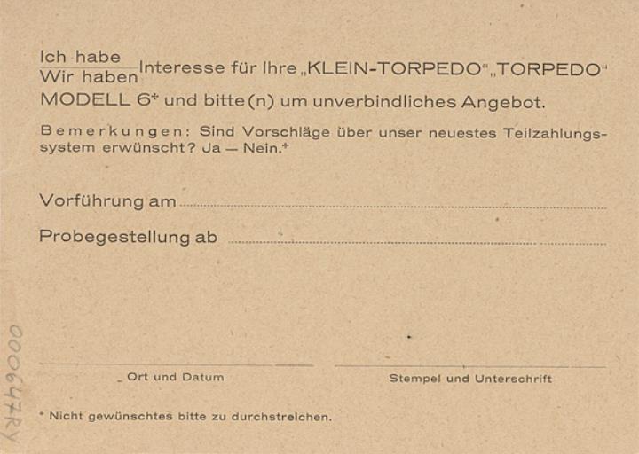 Antwortkarte, monochrom; Nr. F.10036 Vorderseite: vorgedruckte Anschrift Torpedo Fahrräder u. Schreibmaschinen Weilwerke A.-G., Frankfurt a. M. Rückseite: vorgedruckter Anfragetext