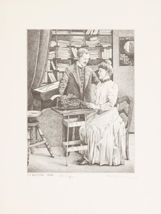 Grafik; Blatt 2 einer Serie (Historische Bureau-Szenen), Künstlerin: Barbara Hohmann monochrom Nr. 645/980