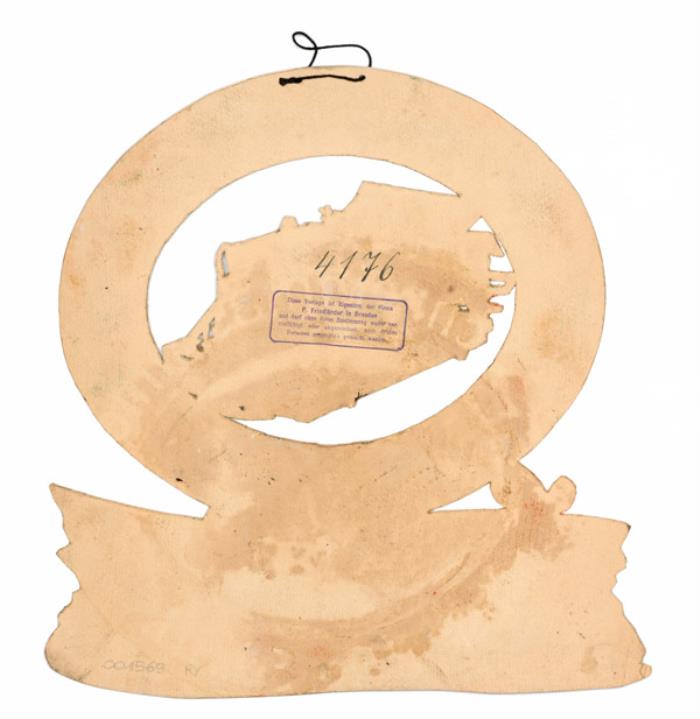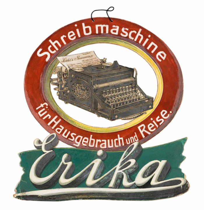 Werbeschild aus Pappkarton (handgemalte Druckvorlage) für Schreibmaschine Erika Rückseite mit Nummer und Stempel: 4176 / P. Friedländer in Dresden [...]