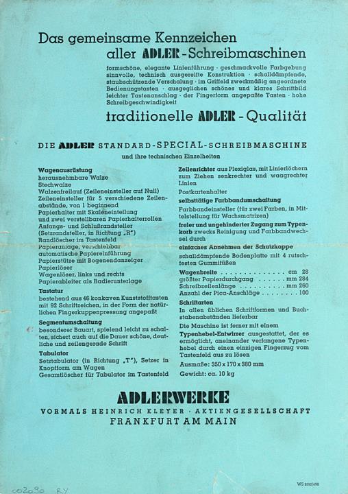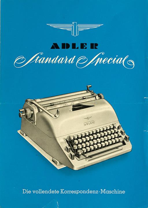Prospekt für Schreibmaschine Adler Standard Special Die vollendete Korrespondenz-Maschine Nr. WS 2010/652