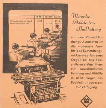 Werbeanzeige für Schreib- und Buchungsmaschine Mercedes Addelektra monochrom