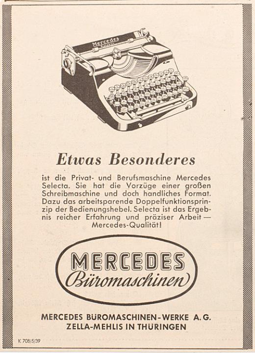 Werbeanzeige für Schreibmaschine Mercedes Selecta monochrom