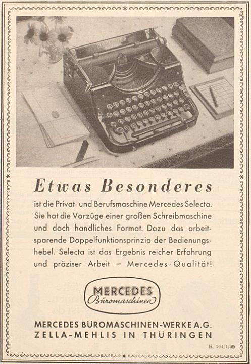 Werbeanzeige für Schreibmaschine Mercedes Selecta monochrom