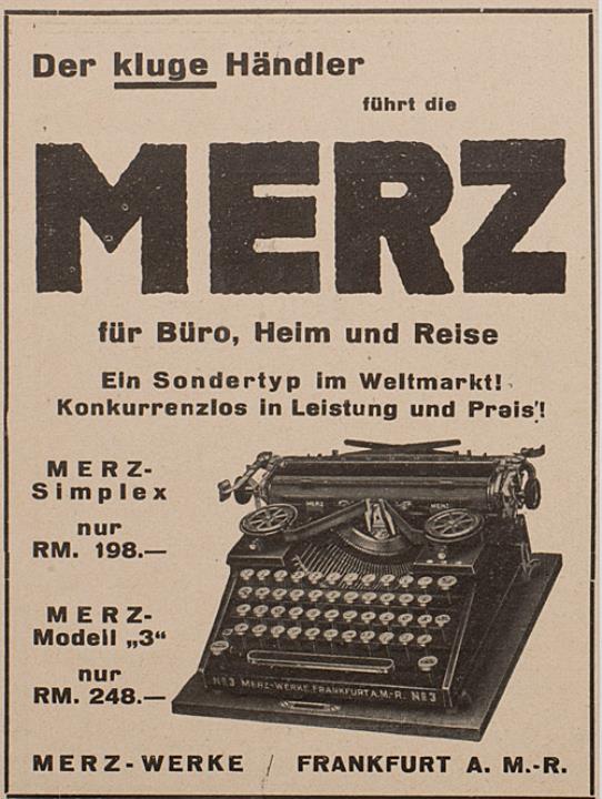 Werbeanzeige für Schreibmaschine Merz monochrom, zwei Exemplare