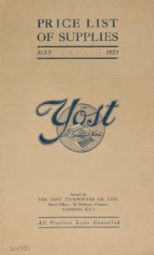 Preisliste für Schreibmaschinenzubehör und Bürobedarf Yost Stand: Mai 1923