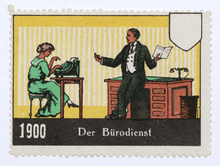 Reklamemarke/Werbemarke zum Thema Büro; rechteckig, polychrom