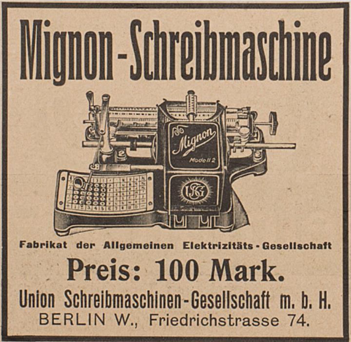 Werbeanzeige für Schreibmaschine Mignon monochrom