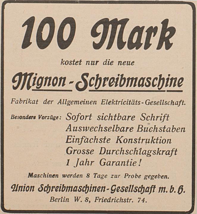 100 Mark kostet nur die neue Mignon-Schreibmaschine