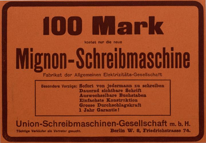 100 Mark kostet nur die neue Mignon-Schreibmaschine