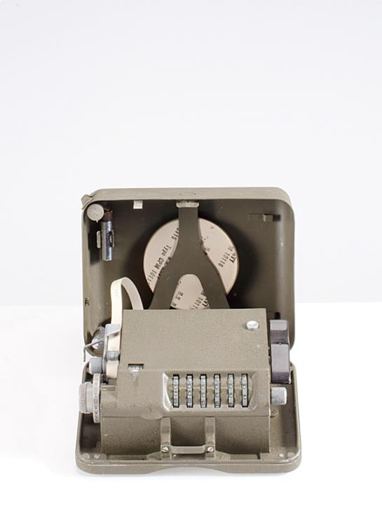 Tragbare mechanische Schlüsselmaschine Hagelin M209 Papierstreifenrolle mit Aufdruck: US NAVY Type CPM 10116